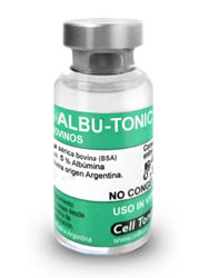 Información sobre el producto: ALBU-TONIC: Albúmina sérica bovina (BSA) al 5%, purificada por precipitación etanólica (True Cohn), pureza > 95%, baja endotoxina, estéril, apta para cultivo de células y embriones in vitro.